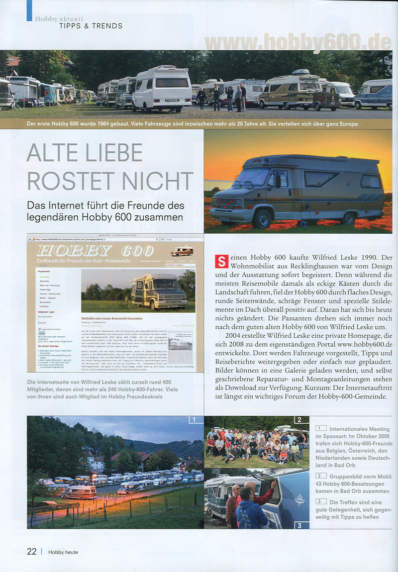 Unter der Überschrift "Alte Liebe rostet nicht" berichtet das Magazin nun in seiner neuesten Ausgabe "Frühjahr 2010" über unseren Hobby 600 und die Webseite www.hobby600.de . Auf einer Seite werden neben meinem Mitternachtssonnenbild vom Hobby 600 auch Bilder von den Treffen in Kemberg und Bad Orb gezeigt. Besonders freut mich der letzte Satz des Beitrags: "Der Internetauftritt (www.hobby600.de) ist längst ein wichtiges Forum der Hobby-600-Gemeinde."