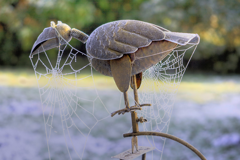 Egal, ich habe diesmal ein Bild aus unserem Garten genommen. Es zeigt einen mit Spinnenweben umspannten Raben. Dieses Windspiel war morgens mit einer Rauhreifschicht überzogen. Weil man im Winter doch lieber im warmen Zimmer sitzt, habe ich das Bild dann mal mit Photoshop nachbearbeitet.