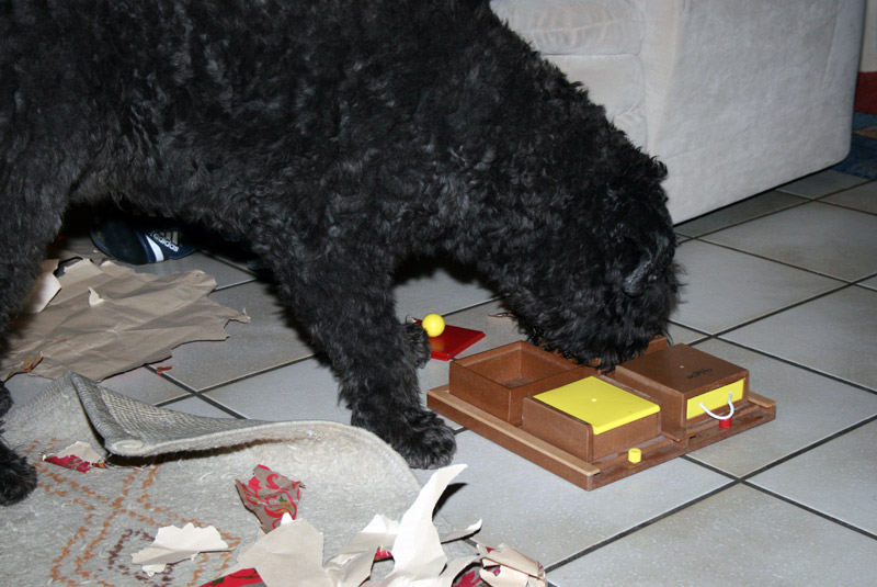 Daher bekam er zu Weihnachten ein Suchspiel für Hunde. Auf einer Platte sind 4 Kästchen, in diese wierden Leckerlies gelegt. Die Kästchen sind alle mit unterschiedlichen Deckeln versehen. Mal muss der Hund den Deckel anheben, mal wegschieben, mal wegklappen oder eine Schublade rausziehen. Den meisten Spaß hatte Giovanni aber beim auspacken....