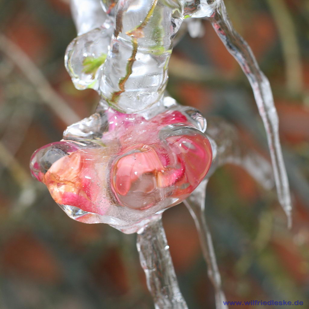 So wurde die Blüte nach und nach von einem Eispanzer umgeben. Jetzt schimmert die rote Rosenblüte in dem Eiszapfen.
