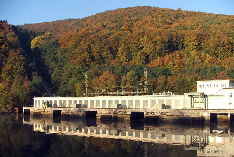 Bald endet für uns die Wohnmobil-Saison. Deshalb waren wir in der letzten Woche für ein paar Tage mit dem Wohnmobil unterwegs. Das folgende Bild entstand bei einem Spaziergang am Pumpspeicherkraftwerk Waldeck I. Im Schein der tiefstehenden Morgensonne kommen die Farben der Blätter so wunderschön rüber. Im Kontrast dazu der weiße Kraftwerksblock und sein Spiegelbild im Wasser der Eder.