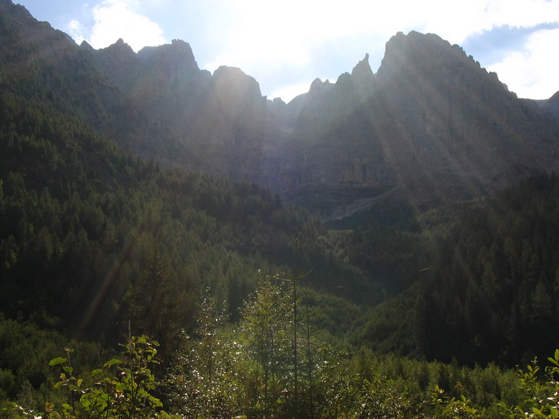 Die letzte Etappe sollte die Königsetappe werden: 2000 hm hoch und 2700 hm runter. Das gute an ihr war, dass die großen Anstiege alle im ersten Drittel der Etappe lagen. Wie immer starteten wir um 9:00 Uhr. Kurz hinter Dimaro bogen wir auf einen Forstweg ab. Durch den Wald ging es nun stetig bergauf. Unterwegs überholten uns drei Mountain- Biker, um uns eine halbe Stunde später in einem Höllentempo wieder entgegen zu kommen. Auch eine Art Frühsport zu betreiben.
