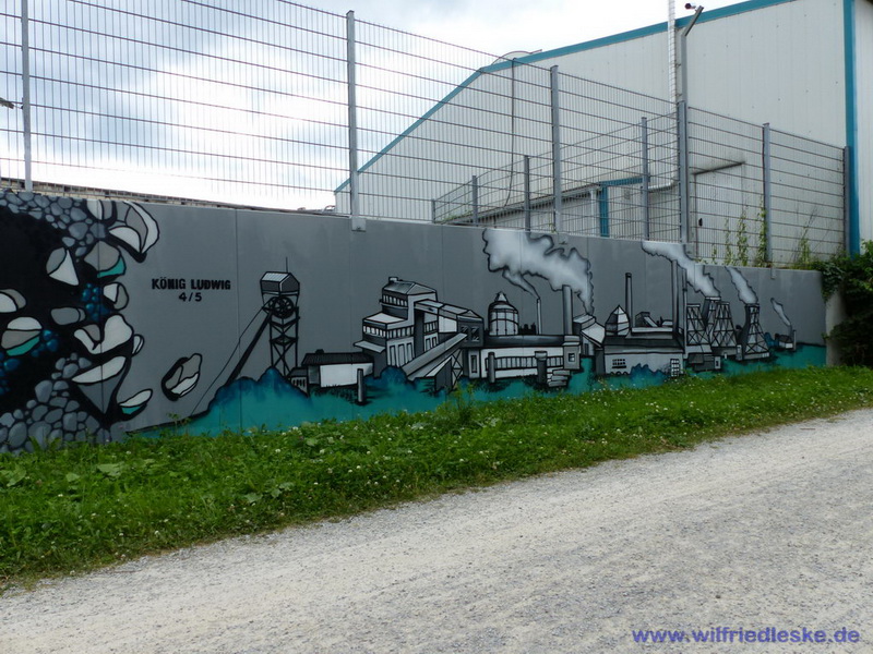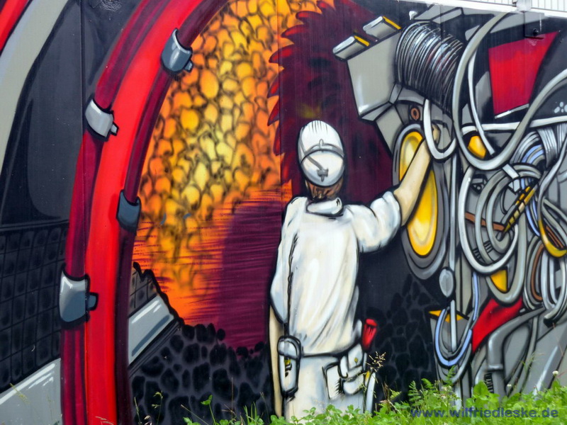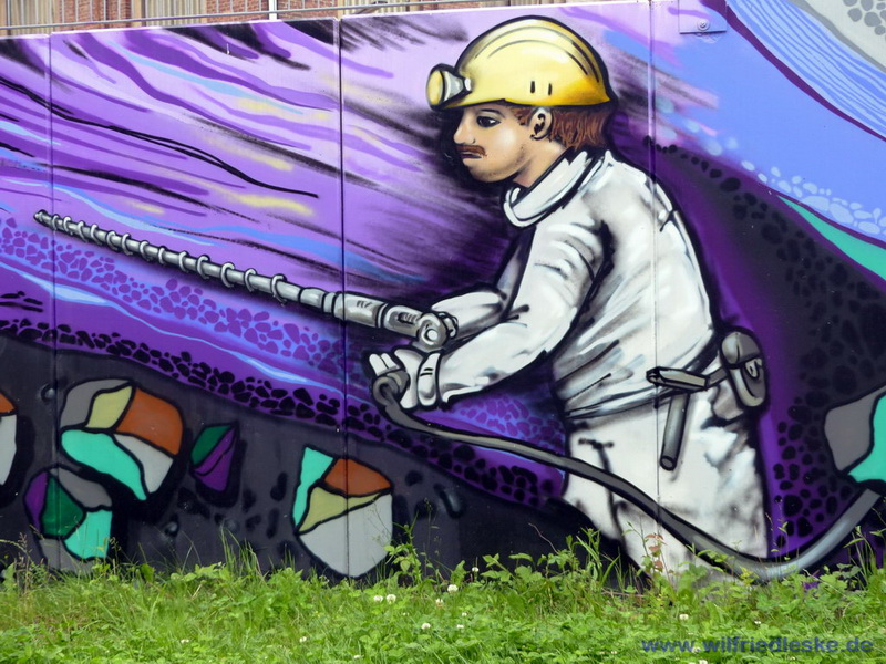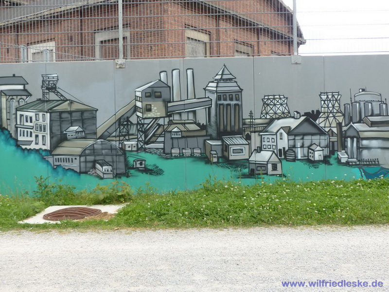 An einer Stelle des Radwegs hat man ein Stück Grubenausbau mit einer original Grubenlokomotive (mit Dieselantrieb) und zwei Loren aufgestellt. Erinnerung an die Bergbaugeschichte. In diesem Bereich wurde die alte Zechenmauer kunstvoll mit Graffitis bemalt, natürlich alles Bergbaumotive. Ein toller Punkt für die Rast während der Radtour.