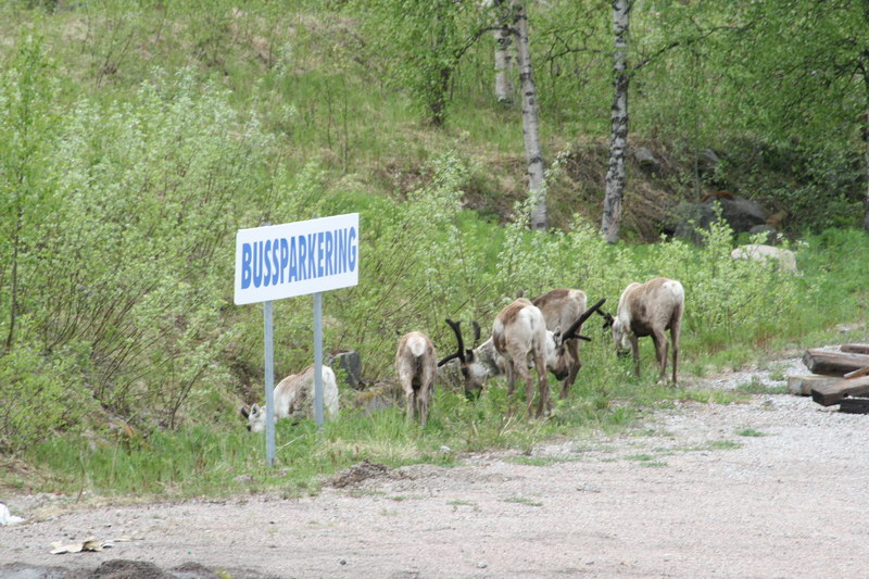 An diesem Tag machten wir wieder reichlich km durch Lappland. Wir sahen viele Rentiere auf und neben der Straße, 2 Füchse und 3 Kraniche. Einmal mussten wir durch eine „kleine" Baustelle fahren. Sie war „nur" 40 km lang und bestand aus einer reinen Schotterpiste. Dafür wurden wir durch einen tollen Rastplatz an einem See und strahlenden Sonnenschein entschädigt. Als Tagesziel erreichten wir den Polarkreis und fanden dort auch einen Stellplatz. Für 110 SKR hatten wir sogar Strom und waren ganz alleine.