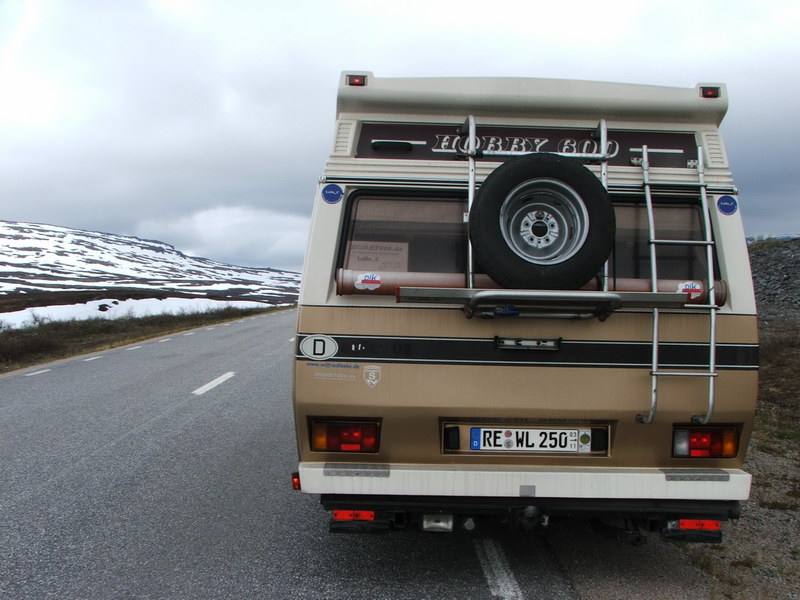 Wir starteten zur letzten Etappe vor den Lofoten. Heute sollte es nach Bodø und dann mit der Fähre auf die Inseln gehen. Aber bis dahin lagen noch ein paar Kilometer vor uns. Die Straße führte uns immer höher hinauf. Die Birken wurden immer mehr durch Moose abgelöst und die Schneefelder wurden immer größer. Mit 760m erreichten wir den höchsten Punkt der Straße. Kurz danach kam auch schon die norwegische Grenze und wieder zeigte sich uns ein Bild, das wir im letzten Jahr auf der Fahrt von Kiruna nach Narvik auch schon gesehen hatten: