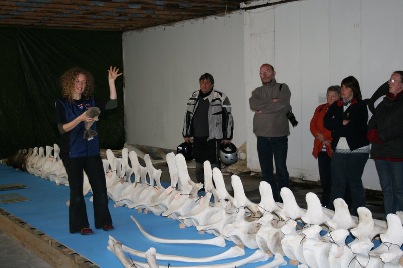 Zunächst wurden wir von unseren Guides begrüßt. Dann bekamen wir ein paar allgemeine Informationen zur Fahrt und den Hinweis, bei Bedarf eine Tablette gegen Seekrankheit einzunehmen. Natürlich hatten wir Bedarf, denn die See war vom gestrigen Wind noch sehr aufgewühlt. Dann wurden wir nach den Landessprachen in drei Gruppen aufgeteilt. Ulrika - so hießt unser Guide - zeigte uns zunächst das Skelett eines Pottwales, der vor ein paar Jahren vor Andenes angeschwemmt wurde. Mit Hilfe eines kleinen Stofftieres erklärte sie uns den Körperaufbau der Tiere. In einem anderen Raum erklärte Ulrika uns, dass es kurz vor Andenes einen Sprung im europäischen Festlandssockel gibt und die Tiefe des Meeres fast schlagartig auf 1000 m zunimmt. Bedingt durch den Golfstrom gibt es hier viel Nahrung für die Wale. Sie erklärt weiter, dass es hier nur männliche Pottwale gibt, die im Alter von ca. 15 Jahren hierher ziehen und sich dann die kommenden 15 nur „voll fressen". Wenn sie dann im Alter von ca. 30 Jahren geschlechtsreif sind, ziehen sie ins Mittelmeer oder zu den Azoren, wo die Weibchen mit den Jungen leben. In einem weiteren Raum wurde uns erklärt, wie die Wale, die ja Säugetiere sind, den Sauerstoff in ihrem Körper bunkern, wie sie mit Hilfe von Geräuschen eine Art Radar zur Ortung ihrer Beute aufbauen und warum sie sich an der Wasseroberfläche ausruhen und dann wieder abtauchen. Wir erfuhren etwas über ihre Beute und dass man die Tiere hier schon sehr lange wissenschaftlich beobachtet und alle Tiere Namen haben. Man unterscheidet sie in erster Linie an der Form ihrer Fluke. Außerdem gibt es einen Wal, der einen weißen Fleck auf der Rückenflosse hat. Das ist Glenn. Er ist nach dem Sohn des Kapitäns des Walsafari-Schiffes benannt und lebt schon seit 1994 vor Andenes.