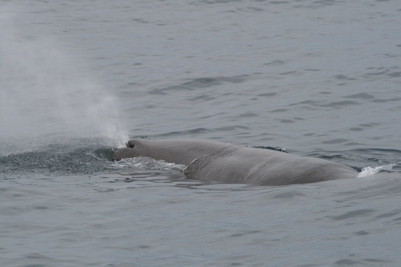 atsächlich tauchte auch er kurz danach auf und der Kapitän drehte das Schiff so, dass der Wal diesmal rechts war. Und wieder das gleiche Schauspiel und wieder klickten die Kameras und diesmal beobachtete Ulrike den Wal mit einer Tüte am Mund. Unsere Guides schauen auf die Uhr. Seit Glenns Abtauchen waren 45 Minuten vergangen. Bald musste er wieder auftauchen. Wie angekündigt erlebten wir auch die nächste Ruhepause des Wales und konnten uns seine Fluke beim Abtauchen noch einmal angucken. Danach hatte er für heute Ruhe vor uns und wir machten uns auf die Rückfahrt. Wir bekamen noch Zertifikate mit den wichtigsten Daten unserer Walsafari ausgehändigt. Ulrike war wieder froh, festen Boden unter den Füßen zu haben. Bis auf die Tatsache, dass wir keine Sonne hatten, war es eine gelungene Veranstaltung. Und wegen der fehlenden Sonne kann man ja irgendwann noch einmal wiederkommen.