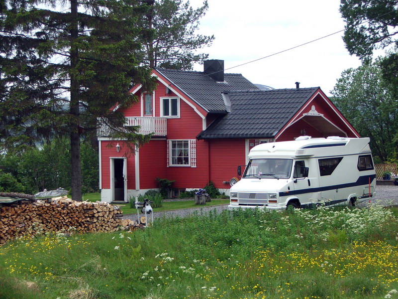 Wir schlenderten einmal durch die Einkaufsstraße und fuhren dann über eine Brücke auf die Insel Langøya. Die Landschaft ist sanfter und weniger spektakulär als auf den Lofoten. Die Berge sind weitgehend abgerundet und zwischen Bergkette und Meer befinden sich zum Teil breite Streifen Weideland. Bei Sortland, dem Hauptort der Versterålen, fuhren wir über die 860 m lange und 30 m hohe Sortland-Brücke und bogen dann nach links auf eine landschaftlich sehr schöne Strecke entlang des Risøysundet Fjord ab. Hier sahen wir übrigens einen schönen Hobby 600 im Vorgarten eines Hauses stehen. Den Hognfjord kreuzten wir mit einer Brücke, andere Fjorde mussten wir umfahren. So erreichten wir die Risøyhamn-Brua. Es ist eine riesige Stelzenbrücke, die in hohem Bogen und mit 750m Länge die Meerenge Risøysundet zwischen den Inseln Hinnøya und Andøya überquert. Diese Meerenge wird ebenfalls von der Hurtigruten durchfahren und musste 1912 aufwändig ausgebaggert werden. Auch heute noch markieren Bojen die flache Durchfahrt.