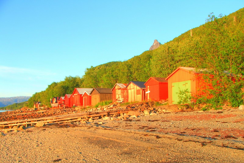 Ursprünglich wollten wir uns hier mit Luc treffen, aber er hatte sich schon vor ein paar Tagen aus Schweden gemeldet. Ihm gefiel es dort so gut, dass er sich zeitlich nicht unter Druck setzen wollte. So stellten wir uns auf den Platz, auf dem Jani im letzten Jahr stand und schwelgten in Erinnerung. Während meiner abendlichen Hunderunde machte ich ein paar Aufnahmen von ein paar Bootshäusern im Sonnenlicht. Langsam war mein Hunger auf Mitternachtssonnenbilder gestillt. Ich saß heute lieber im Auto, las ein Buch und guckte zwischendurch mal auf das Meer.