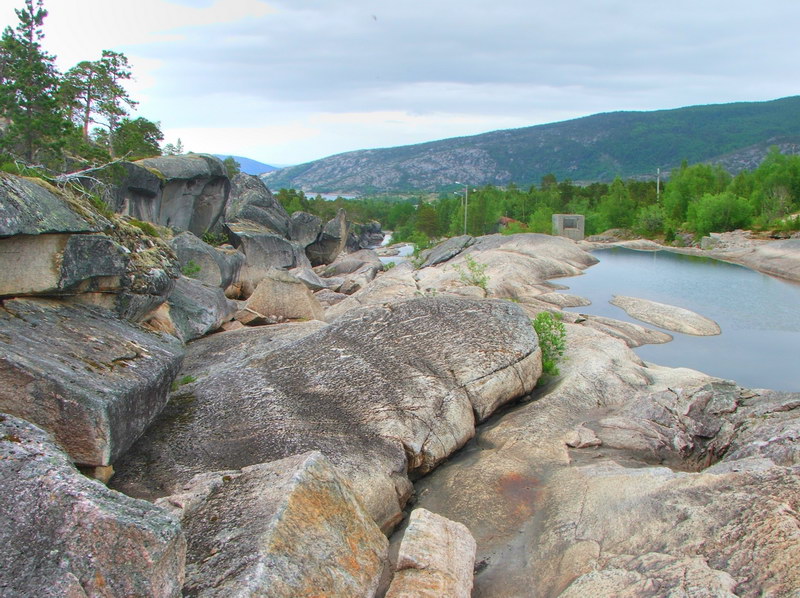 Bei Tømmerneset stoppten wir an einem Rastplatz. Hier gibt es ca. 8000 Jahre alte Felszeichnungen zu besichtigen. Rentiere sind auf blanken, von eiszeitlichen Gletschern geschliffenen Felsen gemalt. Aber auch die Felsen sind in ihrer gradlinigen Ausrichtung sehenswert. So brachte ein Spaziergang etwas Abwechselung, bevor es dann weiter nach Fauske ging. Auf dem Weg dorthin fielen uns einige auffallend flache Straßentunnel auf. Sie waren im 2. Weltkrieg für die Polar-Eisenbahn gebaut und später für die E6 umfunktioniert worden. In Fauske schloss sich für uns wieder ein kleiner Kreis. Das Stück nach Bodø waren wir vor gut einer Woche schon einmal gefahren. Nur diesmal bogen wir in Løding auf die Rv17 ab. Zwischenzeitlich war es schon Abend geworden und wir sahen viele Norweger, wie sie am Ufer Feuer anzündeten und feierten - heute war Mittsommernacht!