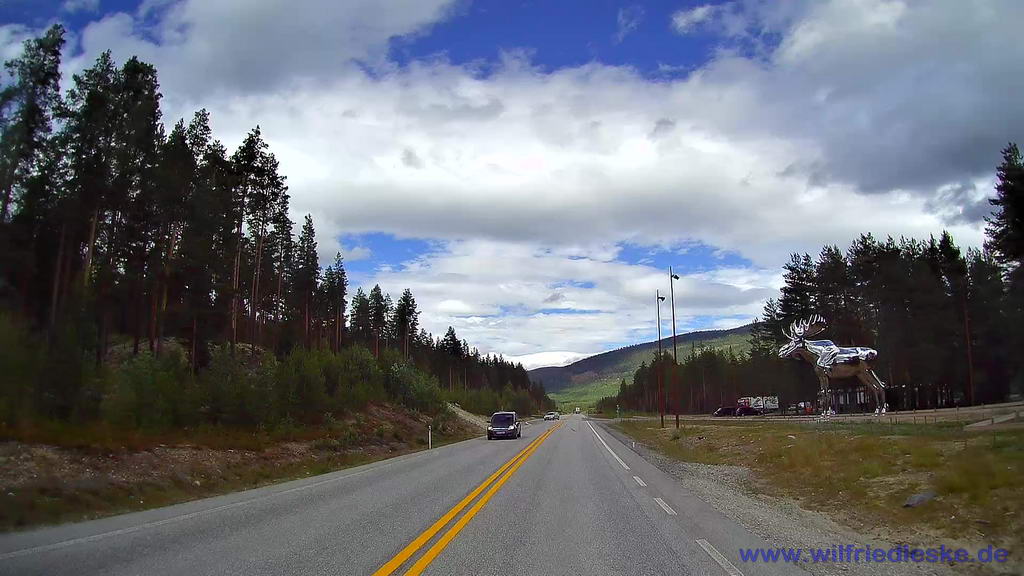 Wir fuhren dann noch bis Moss und übernachteten auf einem Rastplatz an der Autobahn. Am nächsten morgen ging es an Oslo vorbei in Richtung Norden. Bei Elverum verließen wir die E6 und fuhren über die Fv3 durch das Glåmatal. Unser erstes Ziel war der silberne 10 Meter hohe Elch-Koloss aus poliertem Stahl auf dem Rastplatz Bjøråa. Mittlerweile dürfte er der meist fotografierte Elch Norwegens sein.
