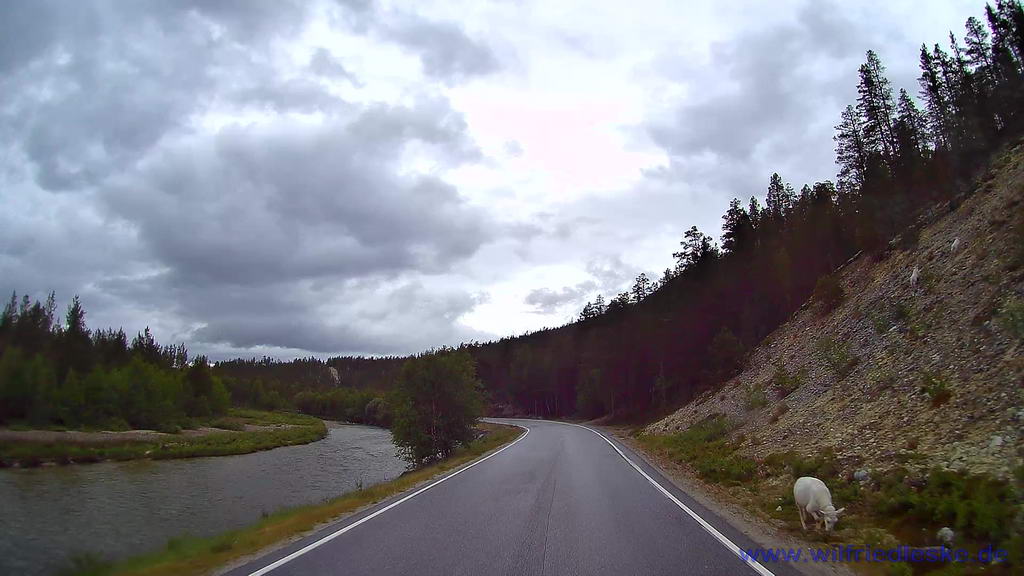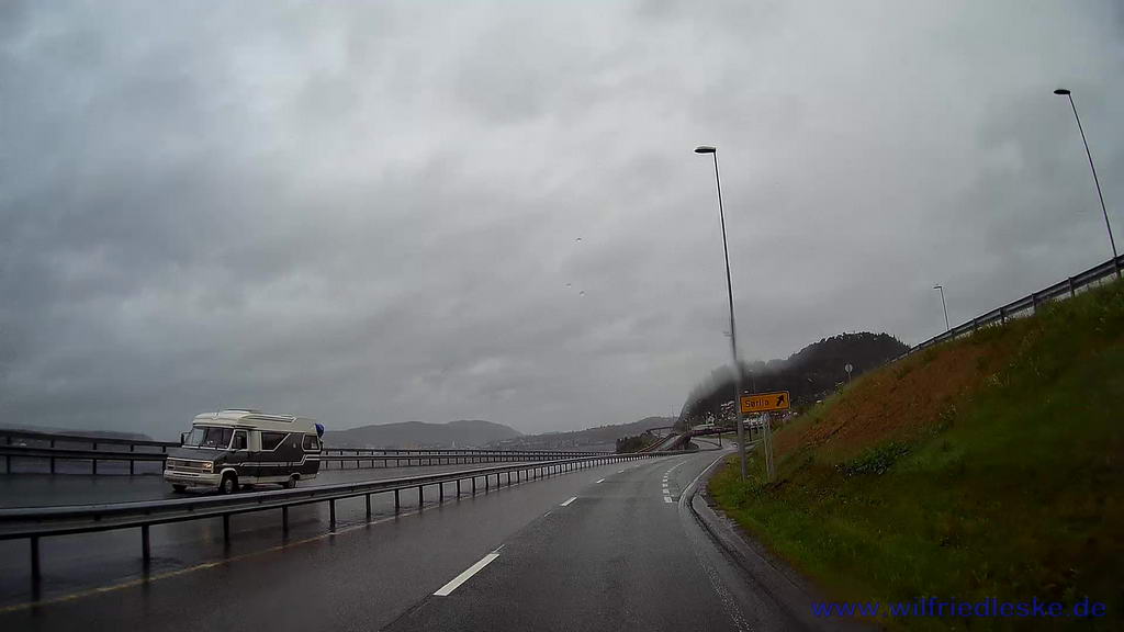Die Bewölkung hatte zwischenzeitlich zugenommen und ein paar Regenschauer sorgten dafür, dass es nicht so staubte. Gegen Abend erreichten wir die norwegische Grenze und fuhren dort zum Zoll, um unseren Hund anzumelden. Aber ich hatte den Eindruck, dass interessierte niemanden. „You are on holiday?“ „Yes“ „Okay“ – das war es. Ein Blick in den internationalen Heimtierausweis, aber keinen Stempel oder sonst etwas. War schon etwas komisch, wie das gehandhabt wurde. Da planen wir entsprechend den Einreisebedingungen für Hunde die Bandwurmimpfung und dann interessiert es niemanden. Ich weiß auch nicht, wie wir im Falle einer späteren Kontrolle in Norwegen hätten nachweisen sollen, dass wir innerhalb von 5 Tagen nach der Impfung eingereist waren, …allenfalls mit den Aufzeichnungen unseres Navis.