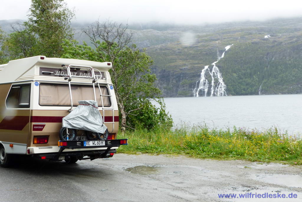 Unser erstes Ziel sollten die Pfahlhäuser in Namsos sein. Auf dem Weg dorthin regnete es fast ununterbrochen. Dennoch mussten wir unterwegs einige Male anhalten, um Wasserfälle zu fotografieren.