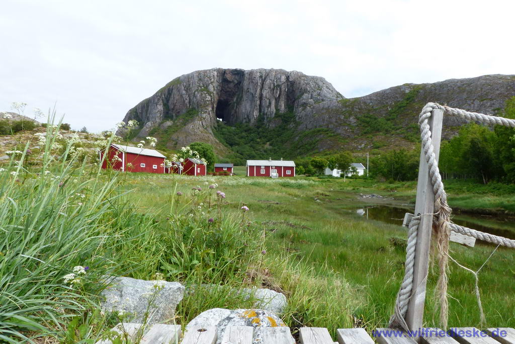 Während unserer Weiterfahrt kam sogar zeitweise die Sonne zwischen den Wolken hervor. So boten sich interessante Bilder am Himmel. Wir folgten der Rv17 über Brønnøysund bis zum Campingplatz auf der Insel Torget. (Bild 14) Hier wollten wir am nächsten Tag eine Wanderung zum Torghatten unternehmen. Der Torghatten ist ein Berg mit einer besonderen geologischen Form. In seiner Mitte hat er ein etwa 35 Meter hohes und rund 160 Meter langes Loch. Entstanden ist es vermutlich durch Ausspülungen der Meeresbrandung während der immer noch andauernden Postglazialen Landhebung nach Abschmelzen der Gletscher aus der letzten Kaltzeit. (Quelle: Wikipedia)