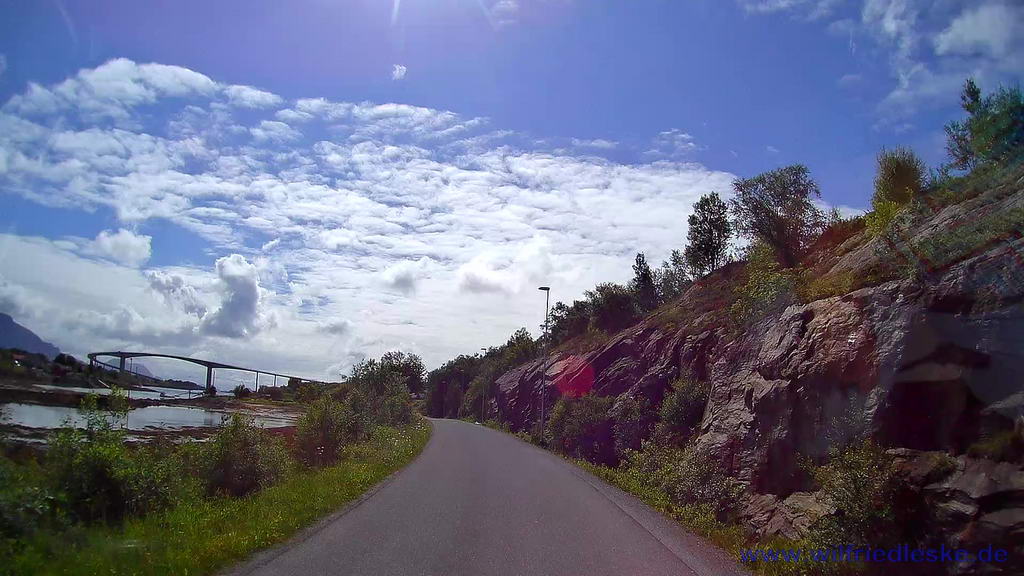 Nach der Wanderung fuhren wir zurück nach Brønnøysund. Hier schauten wir uns zunächst ein weiteres Kunstwerk der Skulpturlandskap an: Steinar Breiflabb. Eine Insel wurde mit Hilfe von Steinen in einen Fisch „verwandelt“. Um den Fisch auch von der anderen Seite sehen zu können mussten wir über eine große Brücke fahren. Dieser Typ Brücke würde uns noch öfters begegnen. Auf engstem Raum wird eine Auffahrt zur Brücke mit 90 Grad umgelenkt Die Brücke ist so hoch, dass auch Schiffe der Hurtigruten drunter herfahren können. Bei starkem Wind möchte ich diese Brücke nicht befahren. Aber wir hatten Glück der Himmel wurde blau. Dieses Glück hielt aber nicht lange an.
