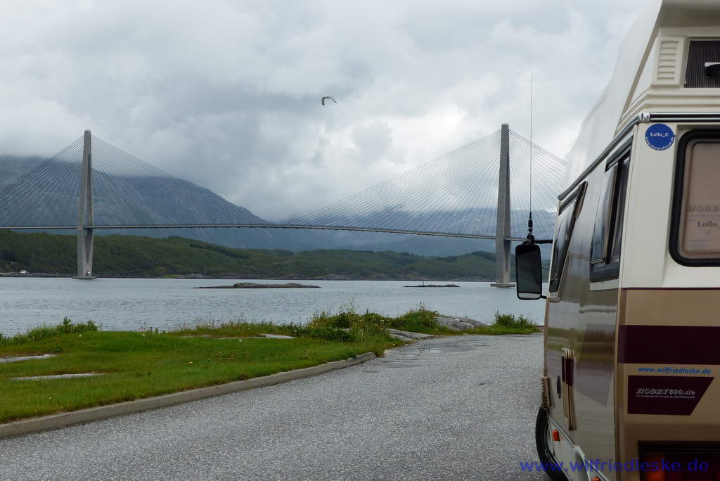 Als wir zum nächsten Fährhafen kamen, war der Himmel schon wieder grau. Schade, so konnten wir die Gipfel der verschiedenen Bergketten nicht sehen. Selbst die berühmten Sieben Schwestern hatten sich vor uns versteckt. Wir benutzten an diesem Tag noch eine weitere Fähre und landeten schließlich hinter Sandnessjøen auf einem Parkplatz unter der Helgelandsbrücke. Von hier konnten wir den Schiffsverkehr unter der Brücke beobachten.