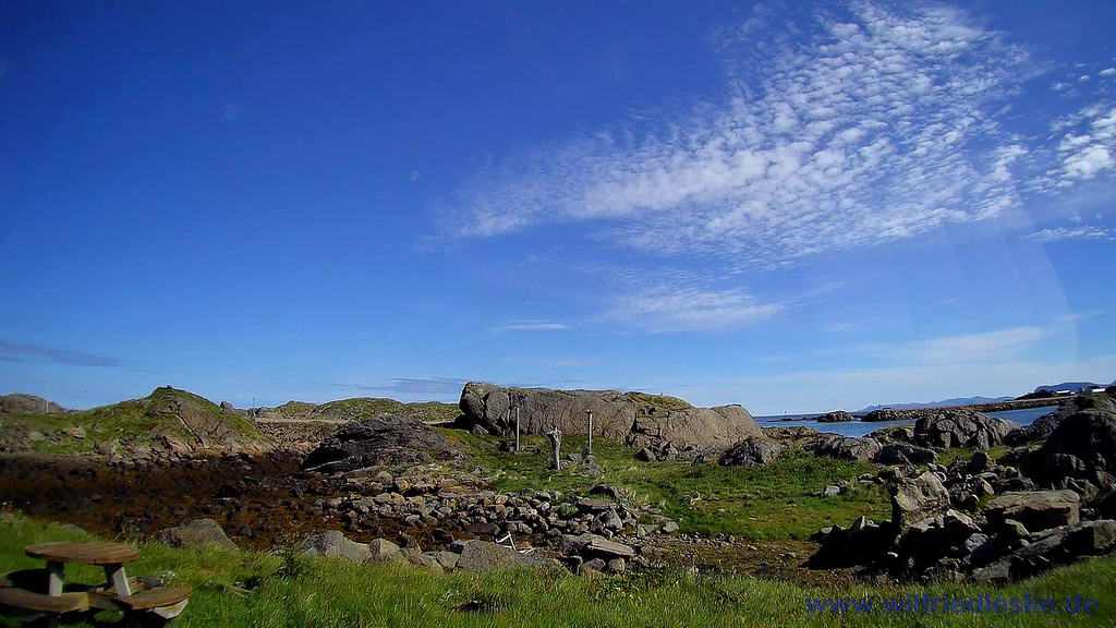 Heute wollten wir den Dorsch grillen, den wir gestern geschenkt bekommen hatten. Aber keine Chance. Der Wind blies den Gasgrill ständig aus, sodass wir den Fisch letztlich im Wohnmobil zubereiten mussten. Wider Erwarten hielt sich der Fischgeruch aber in Grenzen. Dafür schmeckte er umso besser. Unsere Hoffnung auf Mitternachtssonne wurde wieder nicht erfüllt.