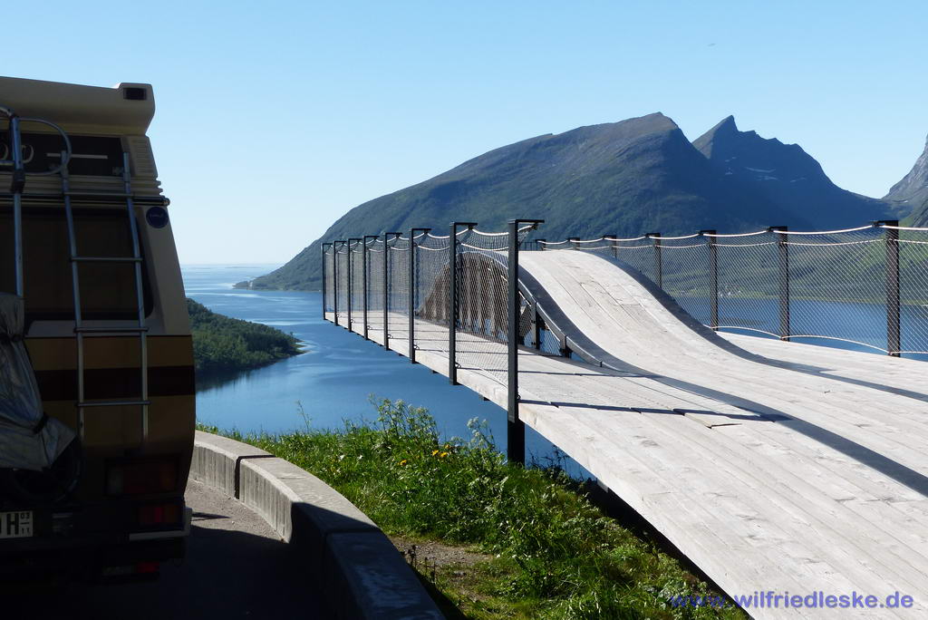 Bevor wir wieder zur Küste hinunterfuhren, hielten wir am Bergsbotn Rastplatz. Hier wurde eine interessante Aussichtsplattform errichtet, auf der man in luftiger Höhe stehen und über den Bergsfjord und das dahinter liegende Meer blicken konnte. Die Fahrt führte uns weiter über eine zeitweise schmale, kurvenreiche Straße nach Skaland. Hier fanden wir einen Supermarkt mit schönem Rastplatz.