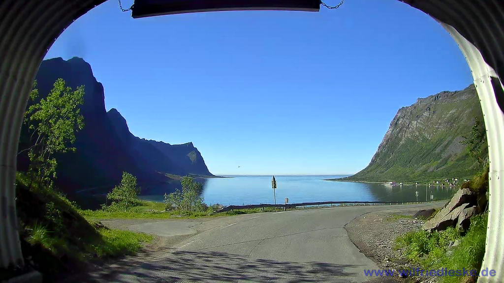 Zur Entsorgung und zum Einkaufen fuhren wir nach Senjahopen. Zwischenzeitlich hatte sich der Himmel wieder zugezogen. Wir setzen unsere Fahrt zur nächsten Fähre fort. Dabei mussten wir wieder mehrere Tunnel passieren. Dabei fielen uns an den Tunneleinfahrten eine Art Briefkasten auf. Sie sind für die Radfahrer und enthalten Warnwesten. Außerdem befindet sich darin ein Schalter, mit dem eine Warnlampe „Radfahrer im Tunnel“ eingeschaltet wird. Am Tunnelausgang muss der Radfahrer die Weste wieder abgeben und die Warnlampe ausschalten.