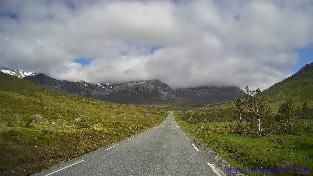 Kurz danach mussten wir die Küste verlassen und auf der Rv862 zunächst einen Berg hochfahren. Im Skalandtunnel fuhren wir schließlich unter dem Berg durch. Dieser fast 2 km lange Tunnel war einspurig und man musste bei entgegenkommenden Fahrzeugen rechtzeitig eine Ausweichstelle anfahren.