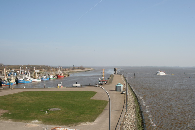 Die Fähre brachte uns am nächsten Tag auf die andere Flussseite. Unser nächstes Ziel hieß Cuxhaven. Der dortige Stellplatz war wegen der bevorstehenden Osterfeiertage schon reichlich voll. Da wir aber nur eine Nacht bleiben wollten, würden wir es schön überleben. Nach einem Hafenbummel fuhr ich mit Giovanni am Rad etwas an der Küste entlang und konnte Schiffe und Leute beobachten.