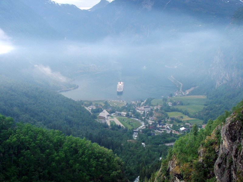 Diese Ausblicke begleiteten uns weiter auf der Rv63. Vor uns tauchte der Dalsnibba auf. Eine mautpflichtige Straße führt noch einmal 500 m höher auf den Gipfel. Von dort hat man eine herrliche Aussicht auf den Geirangerfjord. Wir wollten unserem Womo diese Strapazen allerdings nicht zumuten. Uns reichte der Blick aus rund 1000 m Höhe auf den Fjord. Und dort unten sahen wir ein Schiff liegen. Wie sich später herausstellte war es die „Queen Elisabeth 2“. Das besondere waren aber die Abgase der Queen. Sie stiegen bis zu einer Höhe von ca. 300 m senkrecht hoch und prallten dann auf die darüber liegende Luftschicht. Dort verteilten sich die Abgase waagerecht zu einer blauen Dunstschicht im sonst so klaren Fjord.