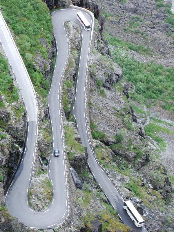 Einem kurzen Abstecher nach Åndalsnes folgte die Fahrt durch das Raumatal. Hier trifft man zunächst auf Trollvegen und Trolltindene, die höchsten Felswände Europas. Sie ragen bis 1800 m hoch, wobei der senkrechte Teil mit fast 1000 m Höhe rund 50 m überhängt. Dass man bei so hohen Felsen die Sonne im Tal selten sieht, ist logisch, dass es mit 20°C ziemlich warm war, ist umso verwunderlicher.