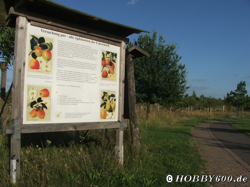 Wir beschlossen am nächsten Morgen erst einmal mit den Rädern nach Templin zu fahren. Als unser Nachbar das sah, kam er sofort wieder an, wann wir denn wegführen…. Der Weg nach Templin führte durch eine schöne Apfelsortenschau. Auf einer schönen Wiese waren ca. 100 verschiedene Apfelsorten gepflanzt. Von jeder Sorte gab es meist drei Bäume, für die Firmen oder Privatleute Patenschaften übernommen haben. …nette Idee!