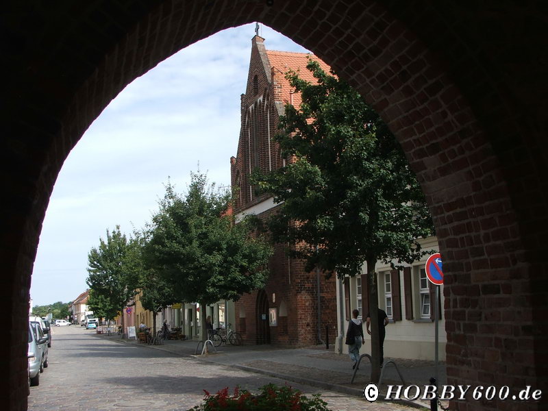 In Templin parkten wir unsere Räder am Busbahnhof und erkundeten die Stadt zu Fuß. Wir schlenderten an den schön restaurierten Häusern entlang zum See. Bei einem (Speise-)Eis beobachteten wir dort die Boote. Zurück führte unser Weg am Rathaus vorbei. Dort fand gerade ein Markt statt und wir hatten Gelegenheit die Produkte der Region zu bestaunen. Als wir zum Wohnmobil zurückkamen, wollte unser Nachbar natürlich sofort wieder wissen, wann wir denn weiter führen. …aber wir aßen in Ruhe unseren eingekauften Kuchen und dann erst ging es weiter. Im Rückspiegel sahen wir noch, wie Frau „Hymer“ ihren Wäscheständer auf den „warmen“ Platz unseres Hobby 600 trug.